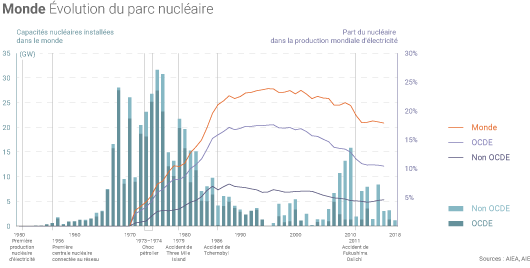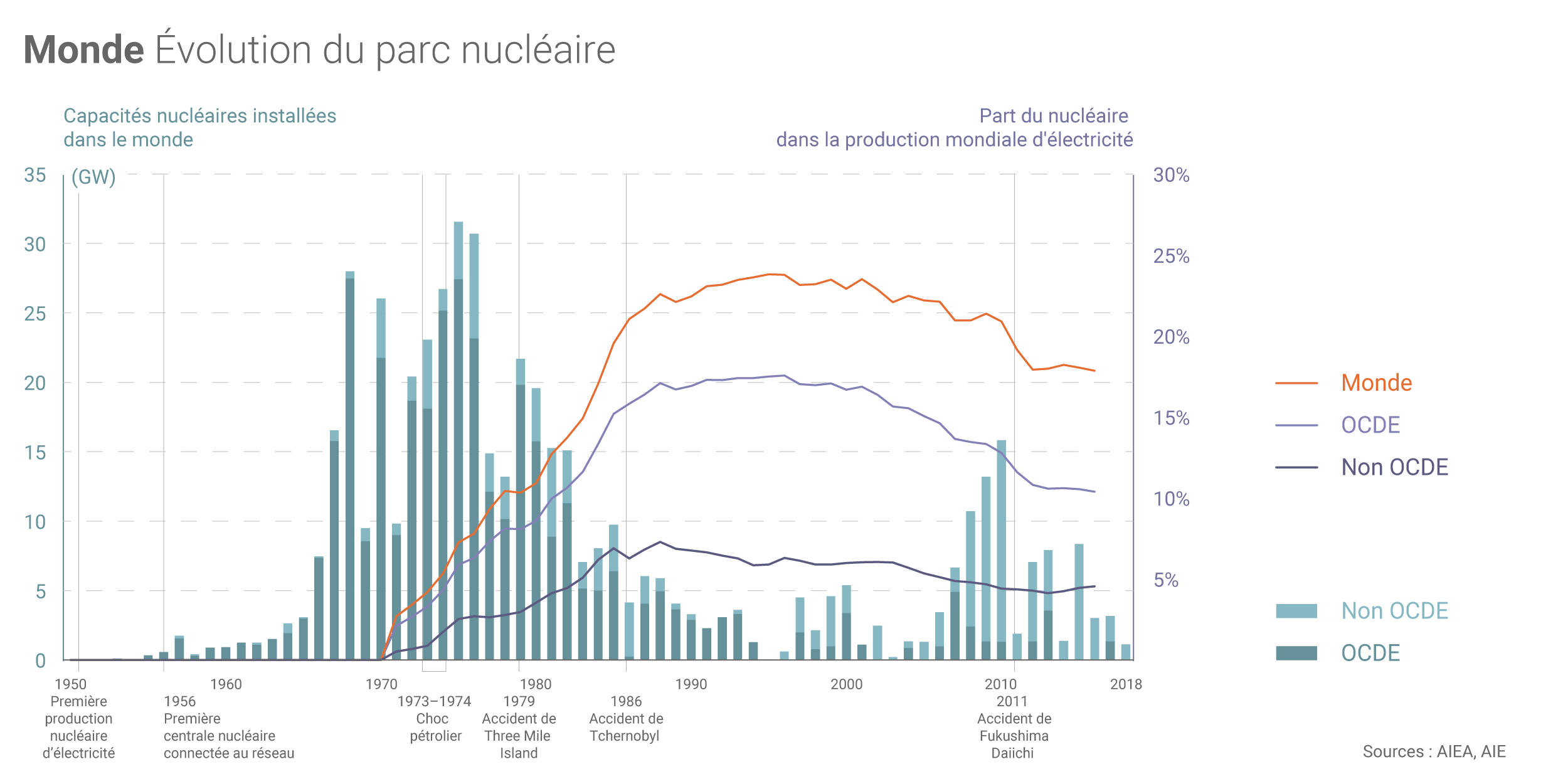 Le parc nucléaire mondial est actuellement composé de 452 réacteurs répartis entre 31 pays. En 2018, ce parc a généré près d’un dixième de l’électricité dans le monde (18% dans les économies qualifiés d’« avancées » par l’AIE(2)). Les filières « bas carbone » dans leur ensemble (nucléaire et renouvelables) ont compté pour 36% de la production mondiale d’électricité l’an dernier. Cette contribution était « identique il y a 20 ans », déplore l’AIE, la croissance des productions éolienne et solaire n’ayant depuis que compensé « le déclin » du nucléaire.