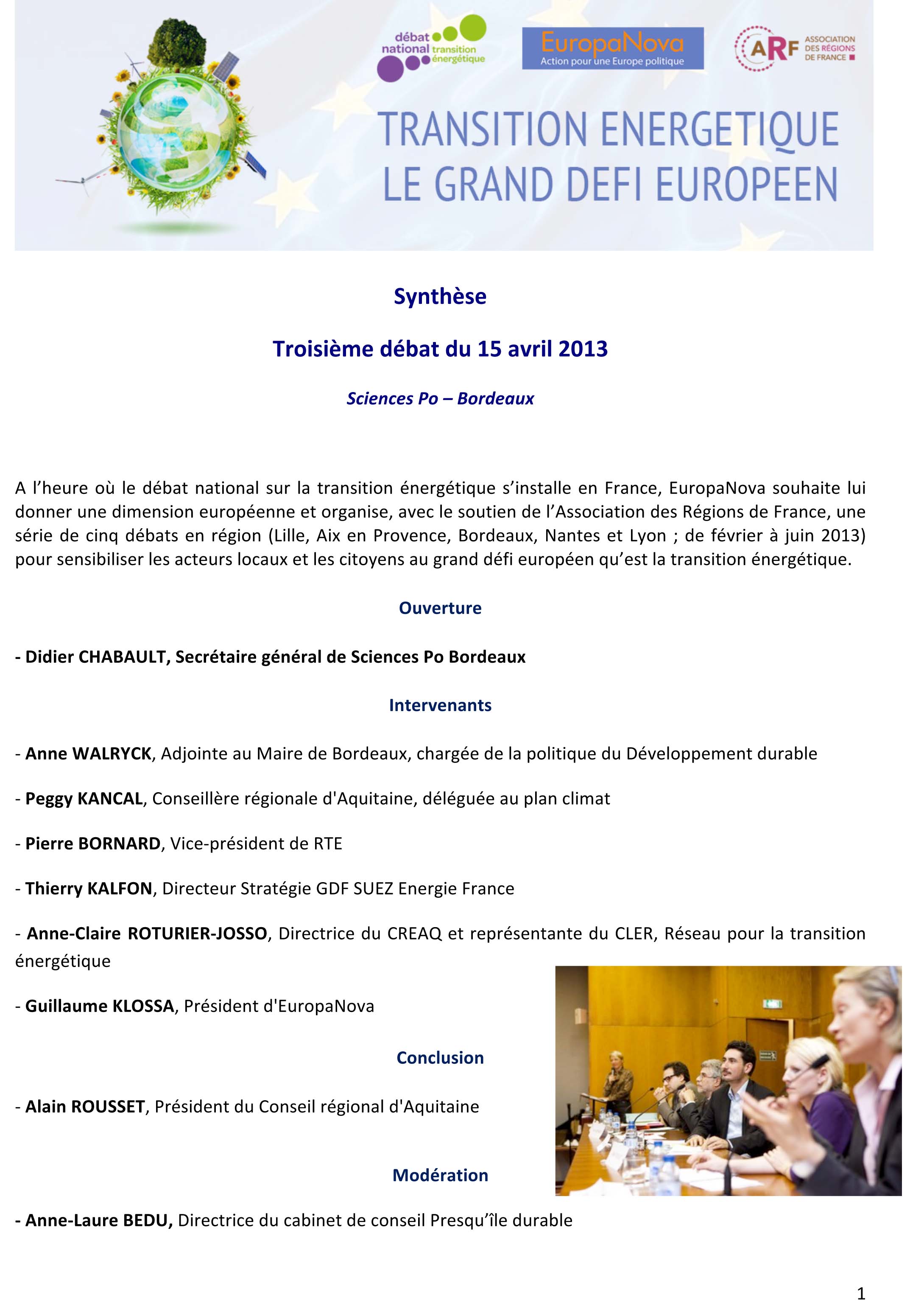 Le think tank EuropaNova contribue à intégrer la dimension européenne dans le débat national sur la transition énergétique à travers une série de cinq débats en région (Lille, Aix en Provence, Bordeaux, Nantes et Lyon). Cette synthèse récapitule les interventions du troisième débat qui s'est déroulé dans les locaux de Sciences Po à Bordeaux.