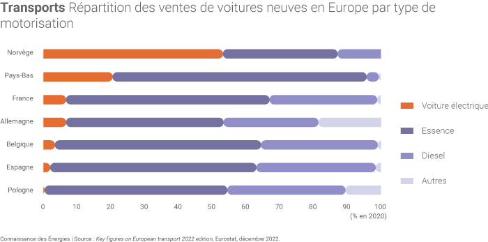 Toujours en 2020, les voitures à moteur essence ou Diesel ont compté pour au moins 80% des ventes de voitures neuves dans « 21 des 22 États membres pour lesquels les données sont disponibles » : les Pays-Bas constituent l'exception, avec 20,5% de ventes de véhicules électriques ou hybrides (loin toutefois derrière la Norvège).