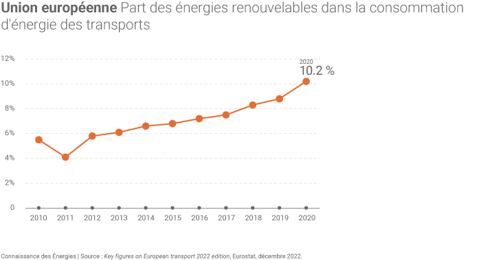 Par ailleurs, la part des énergies renouvelables dans la consommation d'énergie des transports de l'UE n'a cessé d'augmenter depuis 2011 et a atteint 10,2% en 2020.