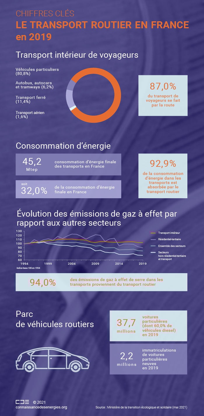 Les produits pétroliers routiers ont à eux seuls compté pour 97,5% de la consommation française d'énergie dans les transports. Depuis 1998, les transports constituent le premier poste contributeur aux émissions nationales de GES. En 2021, les émissions des transports s’élèvent à 126,0 Mt CO2 éq, soit 30 % du total national.