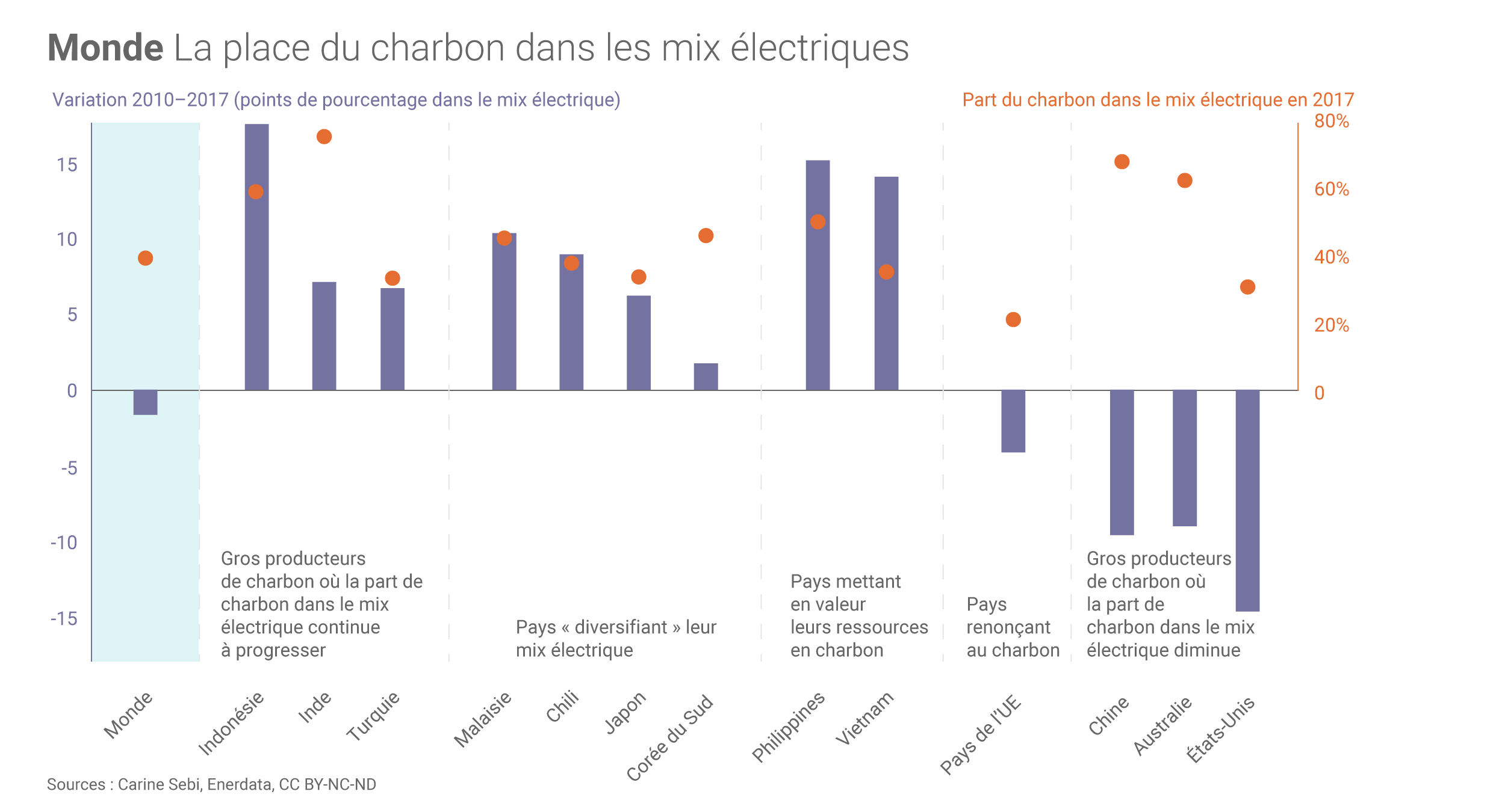 Enfin, certains pays disposant de réserves nationales de charbon, comme les Philippines (50%, + 15 points) ou le Vietnam (34%, + 14 points), mettent en valeur cette ressource pour produire leur électricité et améliorer leur indépendance énergétique.