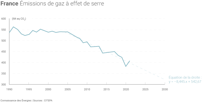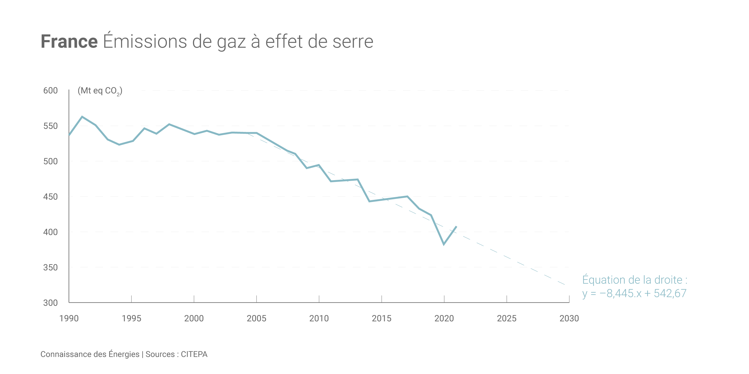 La meilleure tendance qui peut être calculée (à partir du logiciel standard Excel) sur la période 2005 à 2021 est une tendance linéaire, montrant une diminution des émissions françaises de 8,4 Mt d’équivalent CO2 chaque année (avec un coefficient de corrélation(3) R2=0,94). Les émissions durant les cinq dernières années qui se superposent avec le dernier quinquennat se situent bien dans cette tendance, le rebond des émissions en 2021 remettant juste au-dessus de la droite de tendance après la chute de 2020 provoquée par le COVID.