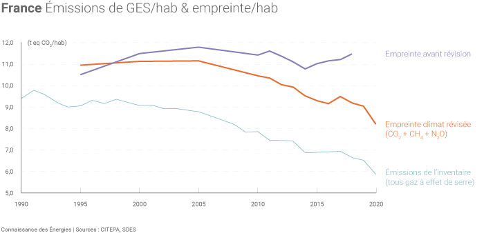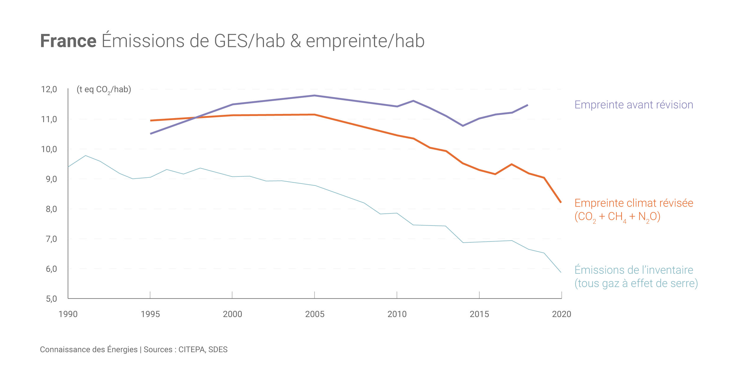 Les dernières données disponibles suggèrent donc que la baisse de l’empreinte climat du pays s’est opérée à un rythme voisin de celui des émissions sur le territoire depuis 2005.