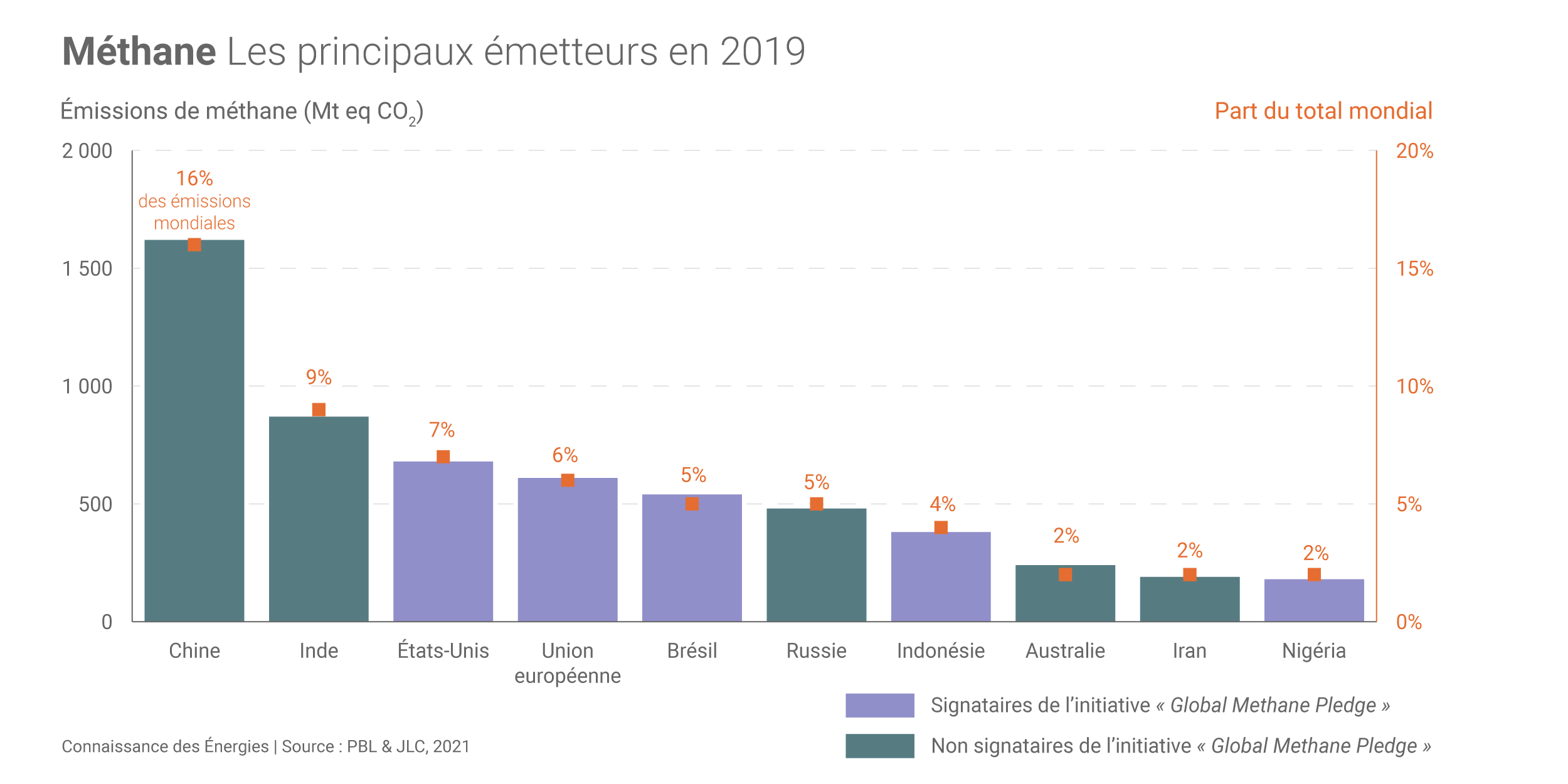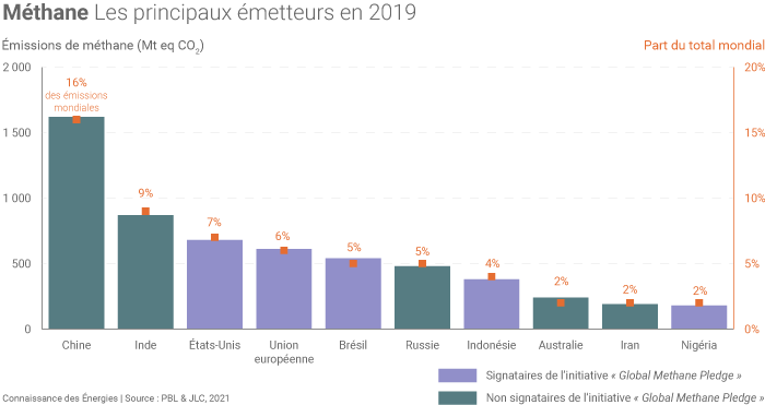 C’est une excellente nouvelle mais l’initiative restera d’une portée limitée si elle n’est pas rejointe par la Chine l’Inde et la Russie, les plus grands émetteurs de ce gaz dans le monde avec les États-Unis(5). D’autres gros émetteurs manquent à l’appel (Australie et Iran si on se limite au top 10, voir infographie ci-après). Les partenaires de l’initiative ne couvrent ainsi qu’environ 40% des émissions mondiales de méthane.