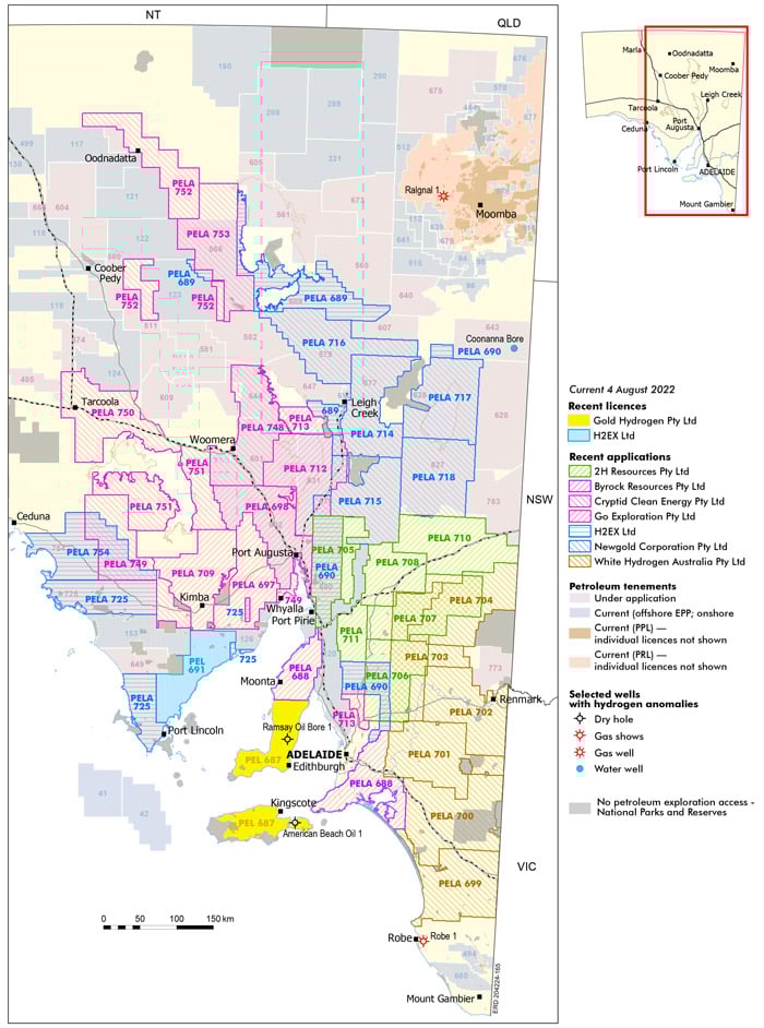 L’Australie est un État fédéral et chaque État y a la responsabilité de son sous-sol. L’Australie du Sud a adapté son droit du sous-sol dès 2021 et les demandes de permis d’exploration se sont multipliées : deux permis ont été octroyés (Gold Hydrogen va notamment forer en 2023 et a repris les zones où de l’hydrogène avait déjà été trouvé au début du XXe siècle) et plus d’une vingtaine de demandes sont en cours d’étude par le gouvernement (voir la carte ci-après).