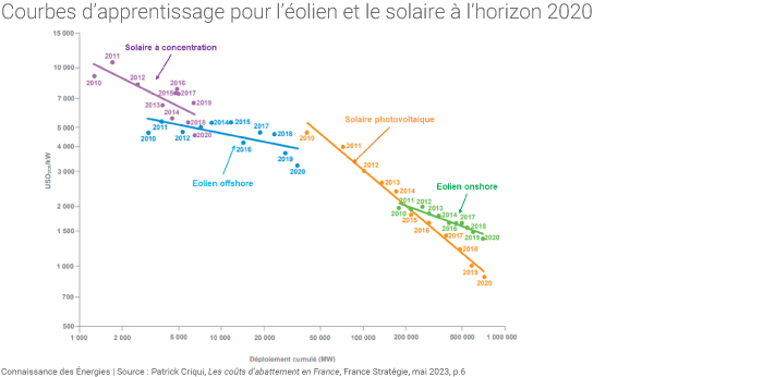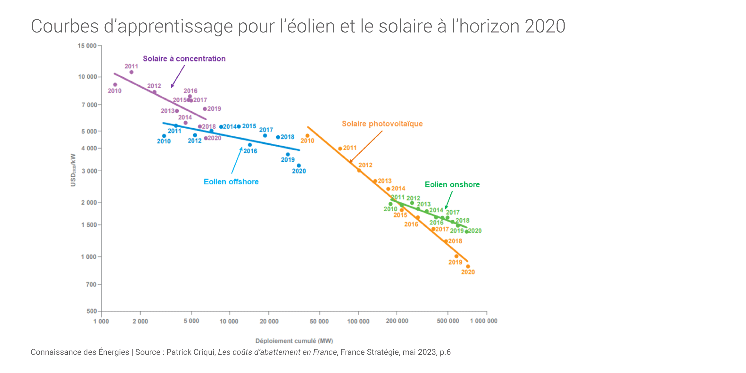 - En premier lieu, dans les secteurs soumis à la régulation européenne du système d’échange de quota, le principe de base repose sur l’action du prix du carbone qui doit en théorie conduire les entreprises à réduire leurs émissions sitôt que le coût de réduction passe en dessous du prix du quota. En pratique, c’est un peu plus compliqué pour deux raisons principales : le jeu des allocations gratuites, subventions déguisées aux énergies fossiles, amoindrit l’efficacité du système dans l’industrie ; il est difficile de connaître à l’avance les coûts d’abattement, surtout dans les secteurs où les gains de productivité sont rapides comme les énergies renouvelables (voir graphique ci-dessous). C’est en particulier une question clef pour apprécier l’opportunité économique de relancer aujourd’hui les investissements dans le nouveau nucléaire dont les coûts de production totaux ne seront pas connus avant 2035-2040. Le risque sera alors, si le projet est effectivement engagé, de renchérir le coût global de l’électron décarboné relativement à celui produit, stocké et distribué depuis des sources renouvelables.