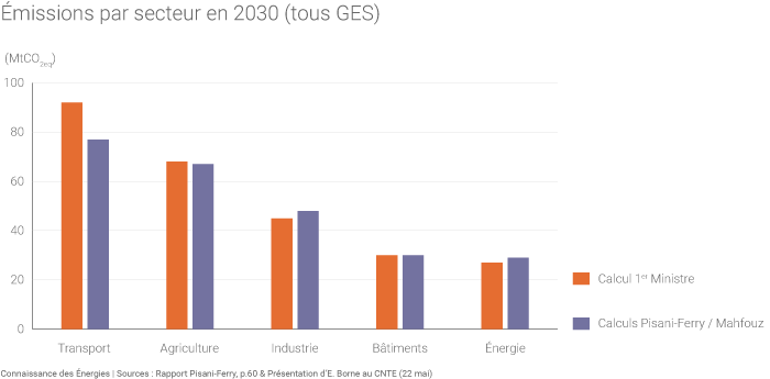 Ces chiffres d’émissions brutes sont repris et décomposés par secteurs, tant dans le rapport Pisani-Ferry/Mahfouz que dans le document présenté le même jour par la Première ministre(3). Ils vont constituer l’ossature de la prochaine SNBC. Trois constats peuvent être faits :