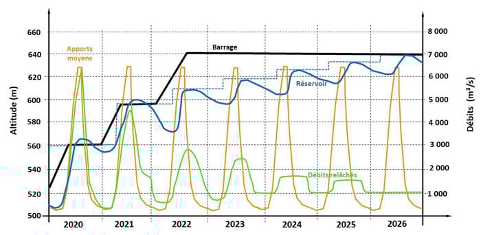 - Ce schéma tient compte de l’achèvement du barrage lui-même dans sa partie supérieure, la mise en service des pertuis aux différents niveaux, l’évaporation du lac au niveau qu’il atteint. Le modèle calcule la production d’électricité en fonction de la cote du lac, du débit turbiné et du nombre de turbines mises en service progressivement au cours de la période.