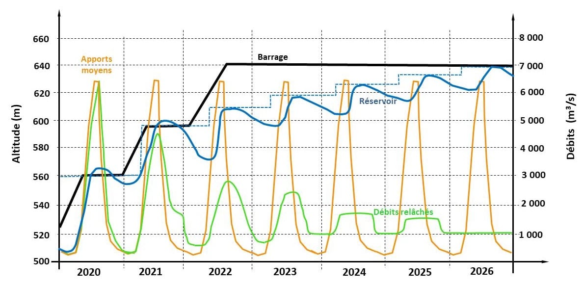 Un schéma de remplissage du lac de retenue de Grande Renaissance (ci-après) s’étalant sur 7 années, a été proposé en juillet 2020. Ce schéma et le modèle qu’il exploite seront réajustés en fonction de la réalité des débits reçus chaque année(12).