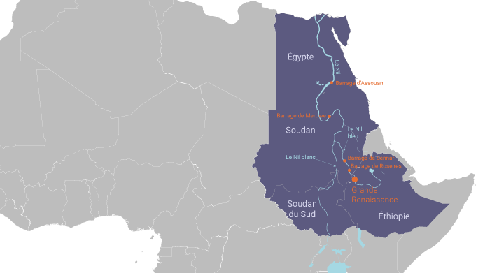 Le Nil bleu s’écoule à partir du lac Tana à 1788 mètres d’altitude, alimenté par un large plateau où les pluies sont abondantes durant la période de mousson. Le barrage de Grande Renaissance est quant à lui construit à une quinzaine de kilomètres de la frontière avec le Soudan à une altitude d’environ 500 mètres. Au Soudan, le Nil bleu rencontre entre autres le barrage de Roseires(3) (qui a été équipé d’une usine hydroélectrique en 1971), puisle barrage de Sennar(4) destiné à l’irrigation (achevé en 1925).