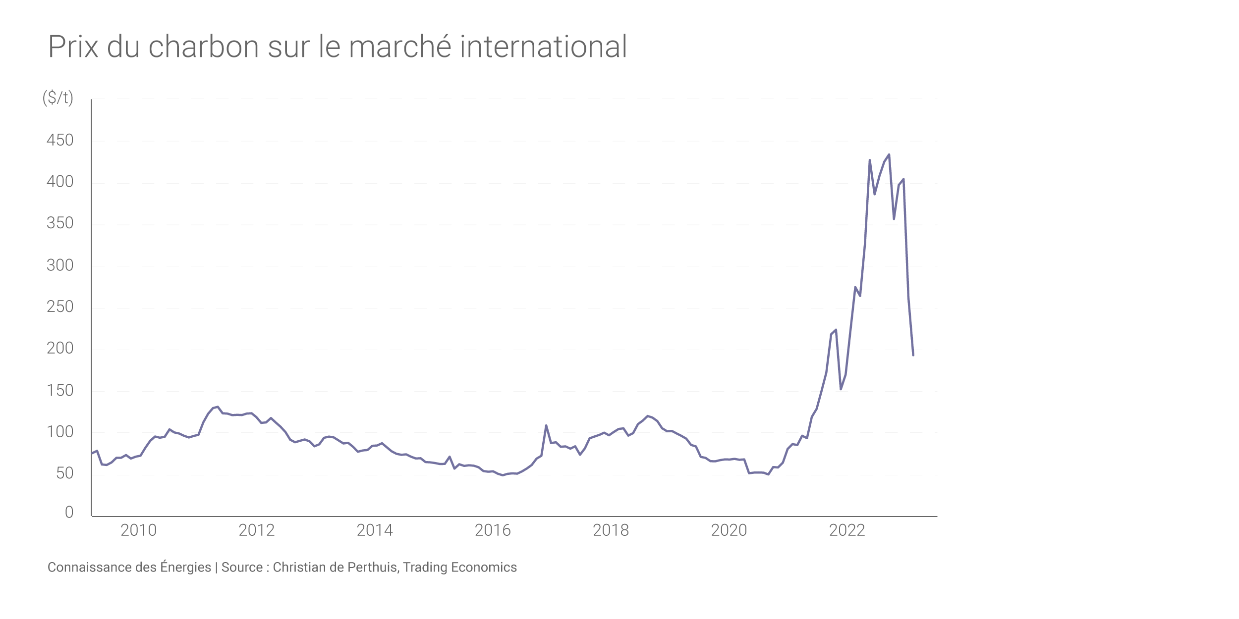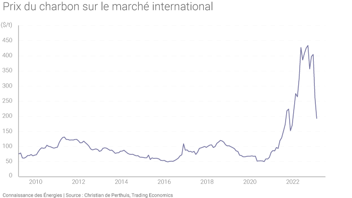 Outre le renforcement de la crédibilité politique, la forte remontée du prix du quota en janvier et février 2023 répond aussi à la baisse du prix du charbon simultanément observée sur le marché de l’énergie. La détente du prix du charbon est apparue sitôt que les risques de rupture d’approvisionnement sur le système électrique, élevés à l’approche de l’hiver, se sont atténués. Elle a été forte et rapide, car l’industrie avait constitué des stocks de précaution dans le nord de l’Europe qui n’ont pas été utilisés.