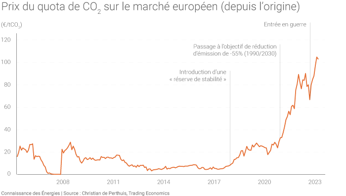 Lorsque la Russie a envahi l’Ukraine en février 2022, les prix de l’énergie se sont envolés. Celui du quota de CO2 sur le marché européen du carbone a perdu un bon tiers de sa valeur. Certains ont alors cru que le système n’allait pas résister à la flambée des prix énergétiques.