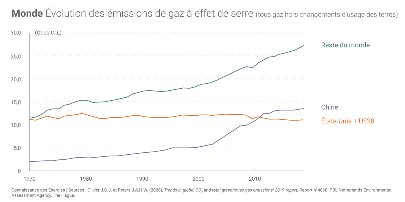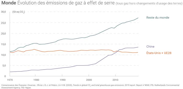 En 2018, les 3 premiers émetteurs de gaz à effet de serre (Chine, États-Unis et UE-28) ont représenté 47 % des rejets mondiaux de GES. Le « reste du monde » en a représenté 53%. C’est lui qui a le plus contribué à l’accroissement des émissions mondiales durant la dernière décennie.