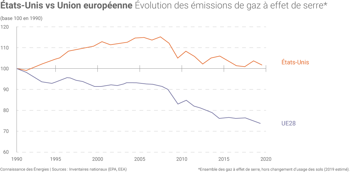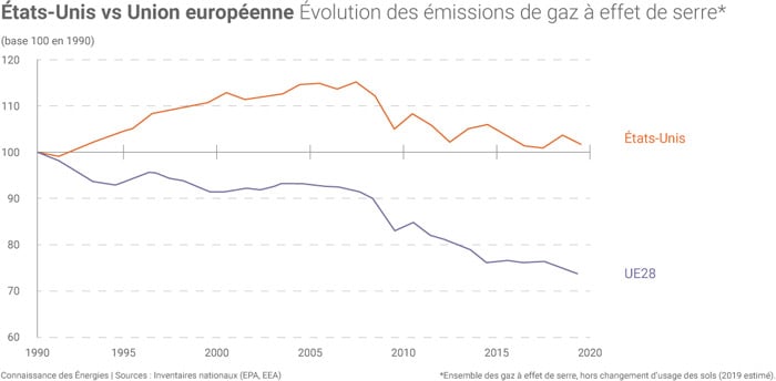 Les États-Unis fixent leurs objectifs de réduction d’émission relativement à 2005 et l’UE relativement à 1990. Un objectif de réduction de 55% relativement à 1990 pour l’UE représente un effort de - 51 % relativement à 2005, soit un niveau proche de l’objectif proposé par Nathaniel Keohan pour les États-Unis.