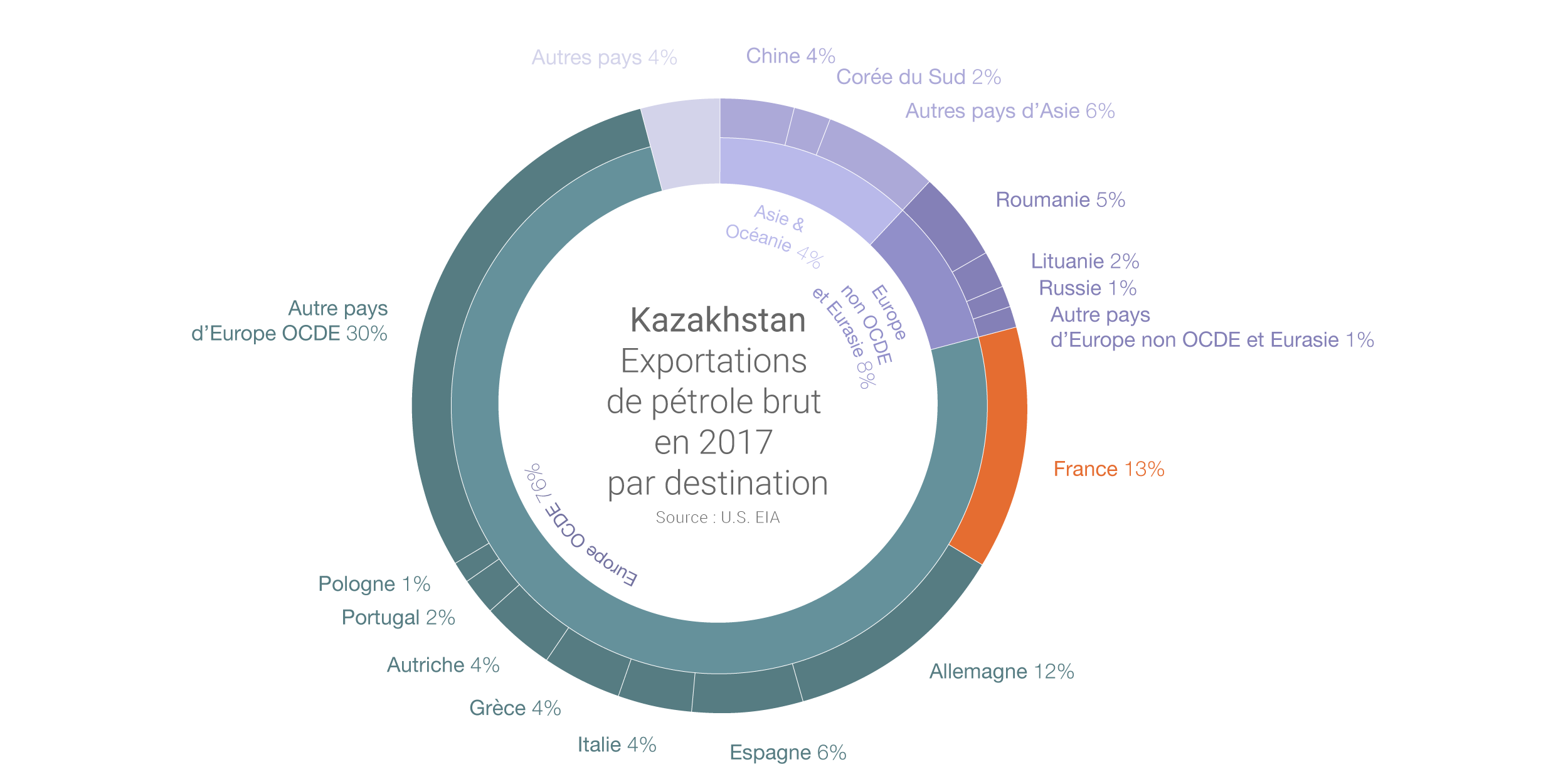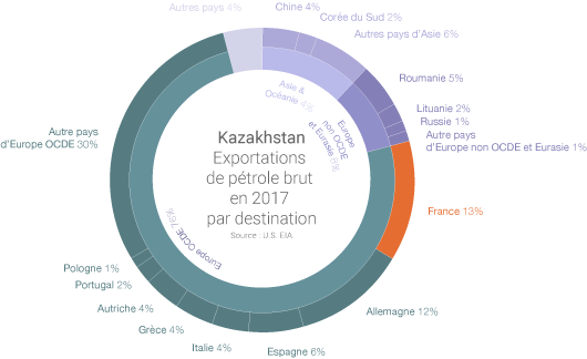 En 2017, les principaux importateurs de pétrole kazakhstanais ont été européens, la France en tête.