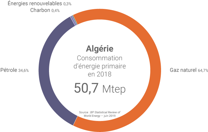 Malgré la découverte de conséquentes réserves d’hydrocarbures non conventionnels (le « pic pétrolier » relatif aux réserves conventionnelles a été annoncé en Algérie dès 2008), l’accroissement de la consommation locale pèse de plus en plus sur la stratégie énergétique des autorités algériennes : en 2018, l'Algérie a consommé 42,7 milliards de m3 de gaz (soit 46% de la production annuelle du pays) et environ 414 000 barils/jour de pétrole (soit 28% de la production annuelle)(13). L’offre en énergies renouvelables - très peu exploitées en Algérie - est actuellement insuffisante alors qu’elle pourrait incontestablement pallier la baisse des réserves conventionnelles de gaz et de pétrole.