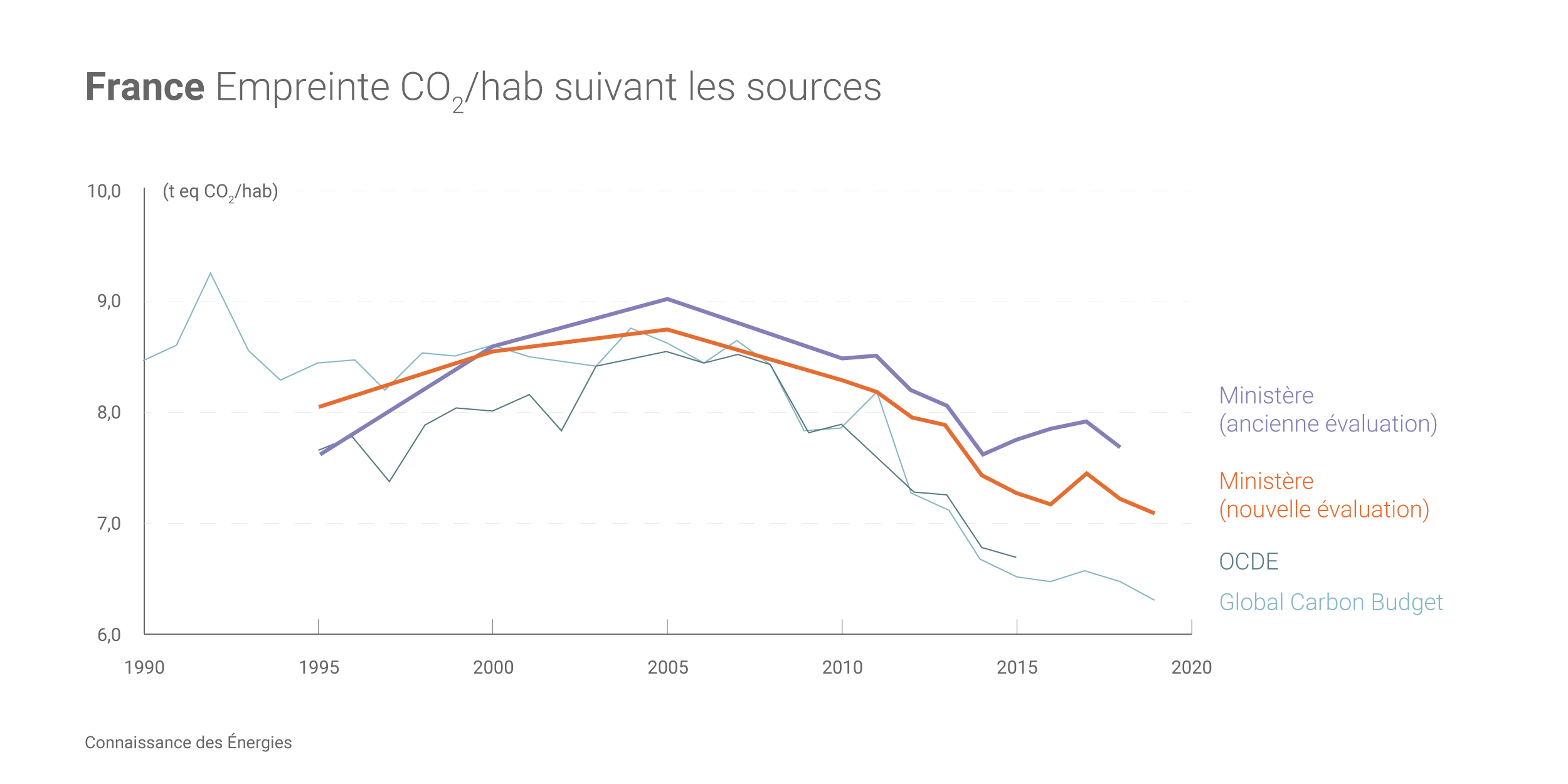 L’empreinte carbone des Français (CO2) suivant trois sources : Ministère de Transition écologique, Global Carbon Budget et OCDE.