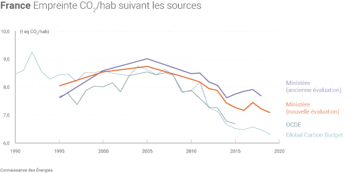 Les premières estimations officielles donnaient pour 2018 une empreinte climat, calculée sur les trois principaux gaz à effet de serre, de 11,5 tonnes d’équivalent CO2 par habitant. Ce chiffre a fait l’objet d’une forte médiatisation, notamment via un rapport du Haut Conseil pour le Climat qui s’est appuyé sur ces évaluations. Les derniers chiffres du SDES, encore susceptibles d’être corrigés, ont ramené ce chiffre à 9,2 tonnes. Il serait judicieux de réexaminer les conclusions de ce rapport à l’aulne de ces nouveaux chiffres.