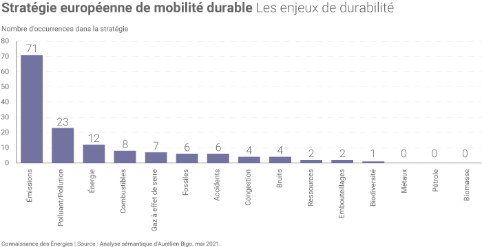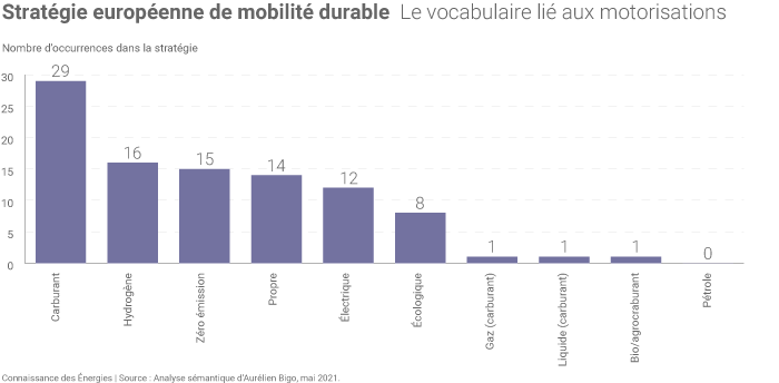 Sans être exhaustive, l’analyse sémantique du document principal de 30 pages porte sur le nombre d’occurrences de certains mots-clés liés à la transition énergétique des transports. Elle met en évidence 6 sujets clés sur lesquels la stratégie fait l’impasse.