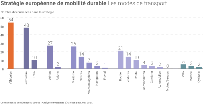 Les modes de transport les plus cités dans la stratégie sont essentiellement les modes les plus lourds, qui font référence au transport ferroviaire (58 occurrences pour « ferroviaire » + « train »), au routier (54), à la navigation maritime et fluviale (51), et au transport aérien (29). Les modes actifs sont au contraire peu cités, alors que la marche (3 occurrences) est le deuxième mode de transport le plus utilisé en temps de transport ou en nombre de trajets en France, et que le vélo (7 occurrences avec « cyclable ») présente encore un très fort potentiel de développement dans de nombreux pays européens.