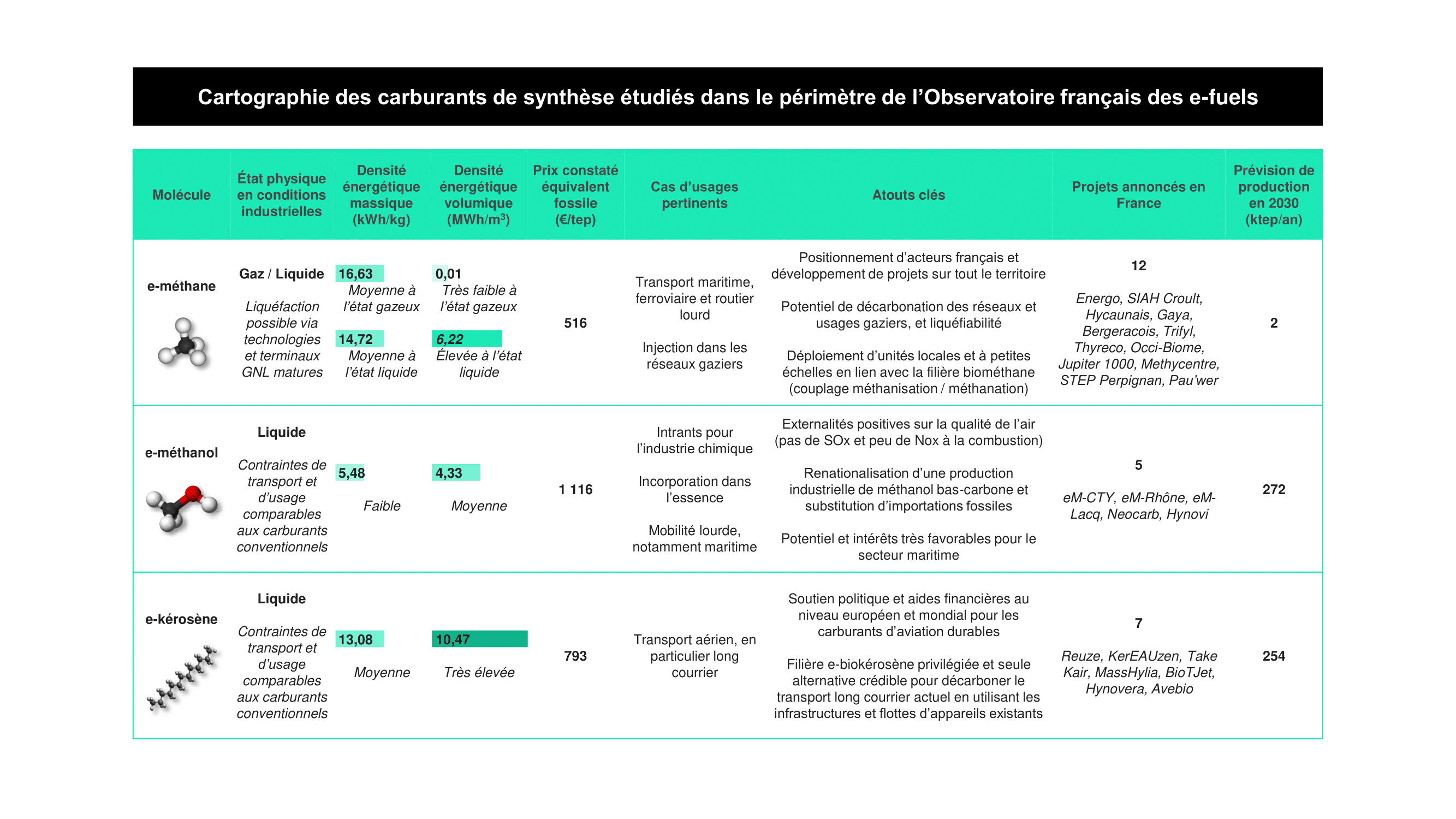 Dans le seul tableau comparatif montré ici on ne voit pas la colonne du rendement entre l'énergie nécessaire à la production de ces e-carburant et la quantité d'énergie que l'on peut ensuite exploité de ces e-carburant..... c'est pourtant un paramètre capital dans les processus convertisseurs d'énergie.