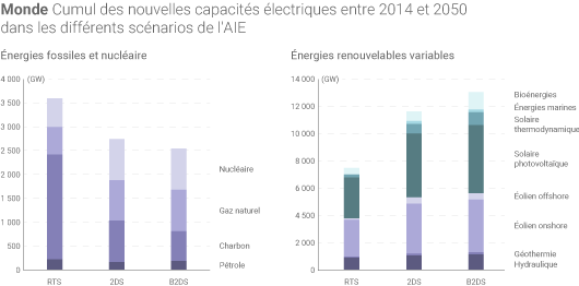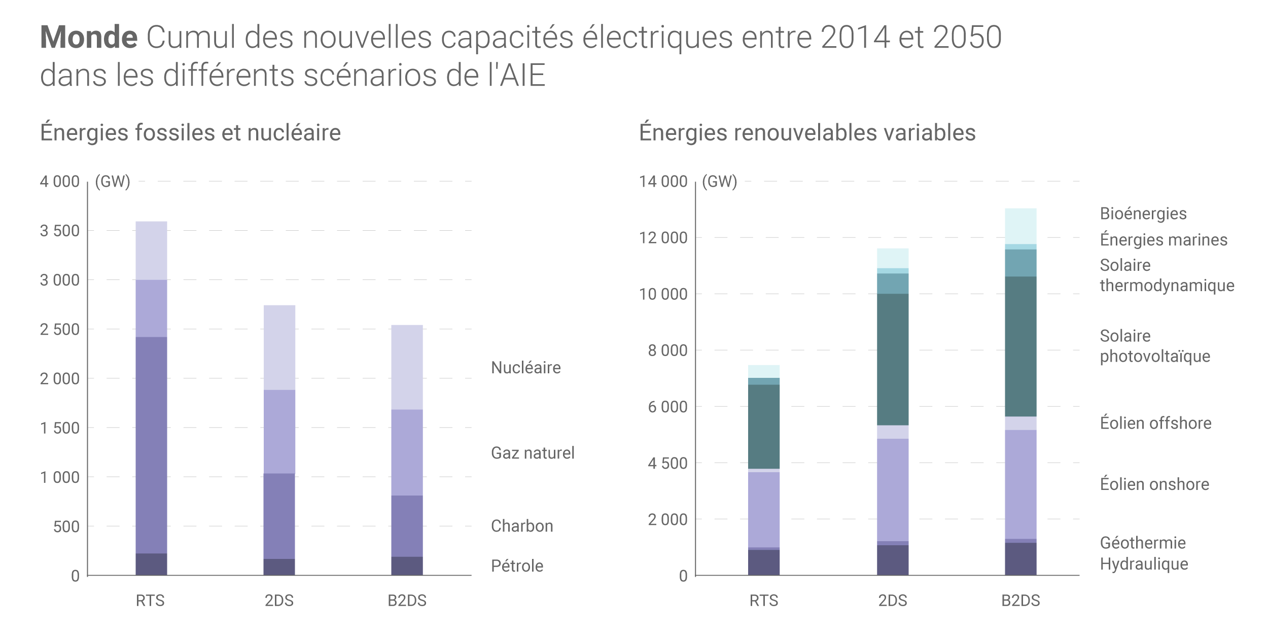 Le rapport Energy Technology Perspectives de 2017(11) décrit par exemple trois mix électriques mondiaux et régionaux pour les décennies à venir, en fonction de l’élévation globale des températures d’ici 2100 : + 2,7 °C (scénario RTS) ; + 2 °C (scénario 2DS) ; + 1,75 °C (scénario B2DS).