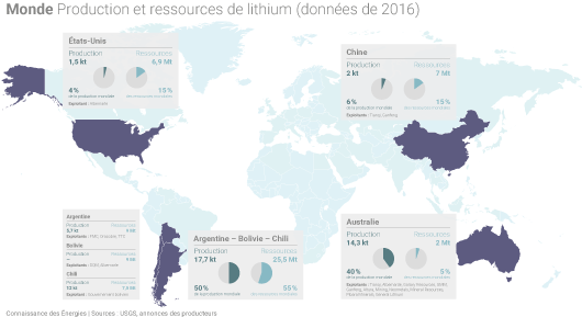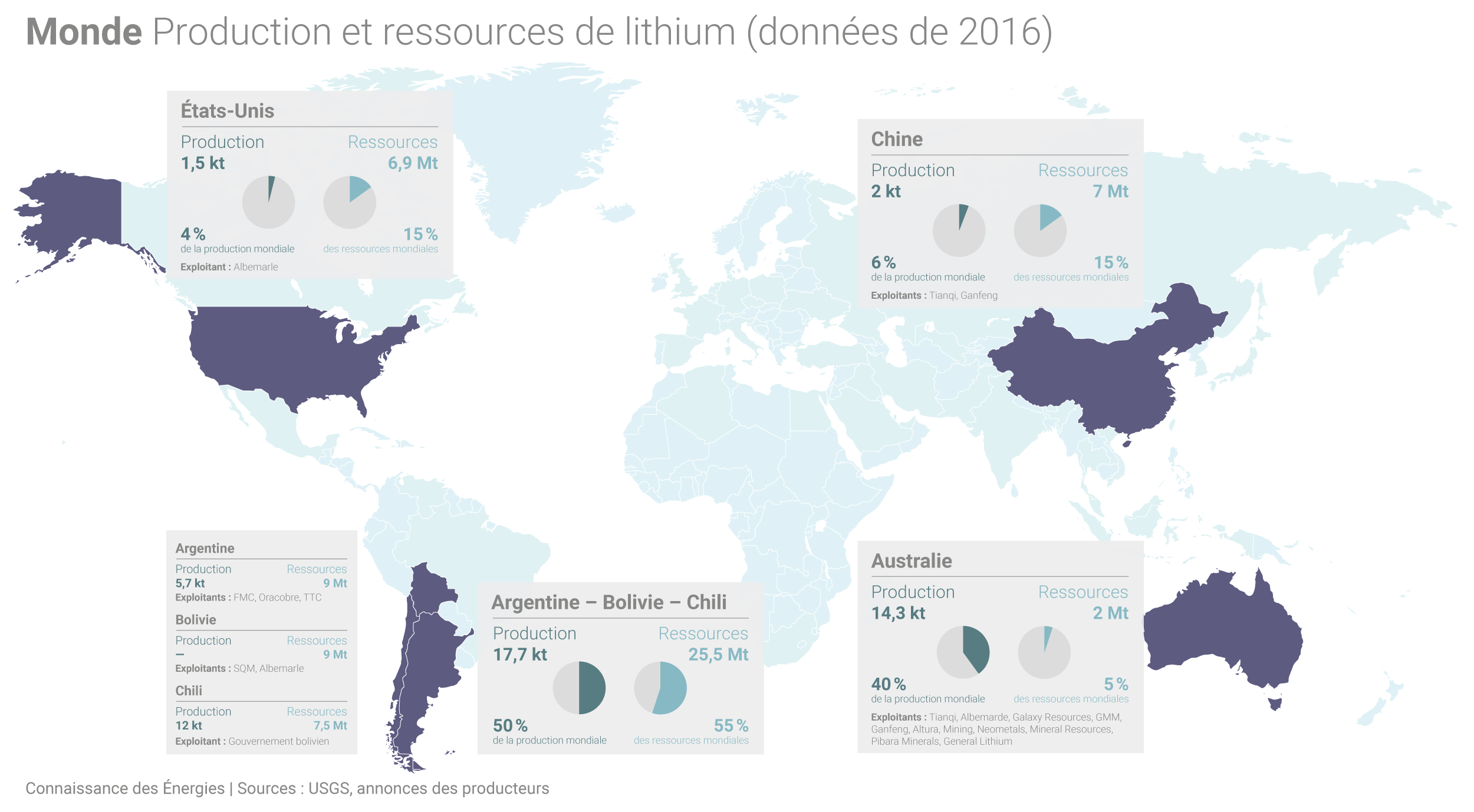 Selon l'institut géologique des États-Unis (USGS), la production mondiale de lithium s'est élevée à 82 000 tonnes en 2020, venant surtout de quatre pays : Australie (40 000 t), Chili (18 000 t), Chine (14 000 t) et Argentine (6 200 t). Viennent ensuite le Brésil (1 900 t), le Zimbabwe (1 200 t) et le Portugal, premier pays européen avec 900 tonnes de lithium, mais pas de "qualité-batterie".