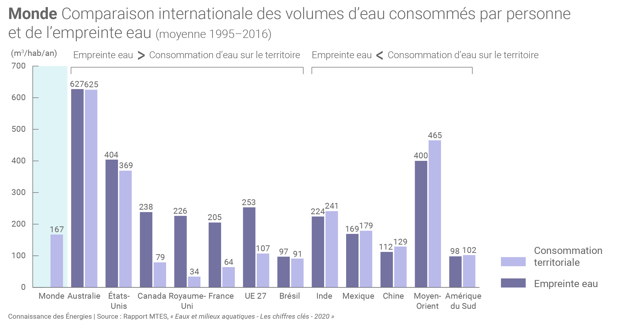 L’empreinte eau des citoyens des pays de l’OCDE est, en moyenne, plus élevée que celle des pays hors-OCDE. Celle d’un Français est par exemple supérieure à 200 m3/habitant/an alors qu’elle est de 167 m3/habitant/an au niveau mondial.