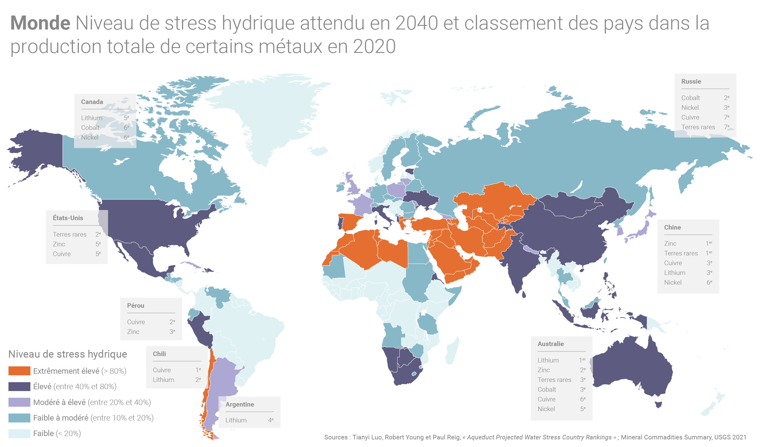 En outre, pour bon nombre de métaux étudiés, la production minière ou les activités de transformation sont effectuées dans des pays où la pression sur la ressource en eau est déjà forte et pour lesquels la situation hydrique n’est pas, dans l’état actuel des choses, amenée à s’améliorer dans les décennies à venir.