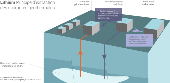 L’Association française des professionnels de la géothermie (AFPG) évalue aujourd’hui la coproduction possible de lithium en Alsace à 15 000 tonnes par an sur 10 sites géothermiques. Jusqu’à présent, ces eaux géothermales chaudes étaient exploitées pour la récupération de chaleur et la production de chaleur et d’électricité. Le modèle économique consiste à associer les deux exploitations, d’une part pour augmenter la production de chaleur et d’électricité décarbonées et d’autre part pour produire du lithium métal.