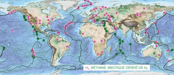 Carte non exhaustive des émanations déjà connues d’hydrogène natif et de méthane abiotique dérivé de l’hydrogène qui réagit en particulier au niveau des fumeurs avec le CO2. (©Isabelle Moretti, modifiée d’après Prinzhofer et Deville, 2015)