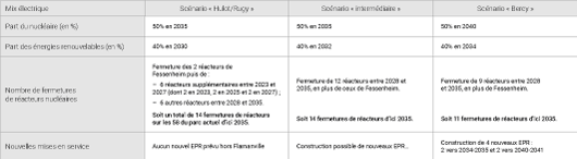 La vraie divergence entre ces scénarios ne tient pas aux dates, assez proches, de réduction de la part du nucléaire mais au fait que seul le troisième scénario envisage de façon explicite de construire de nouveaux réacteurs : 4 EPR, 2 vers 2034-2035 et 2 vers 2040-2041.