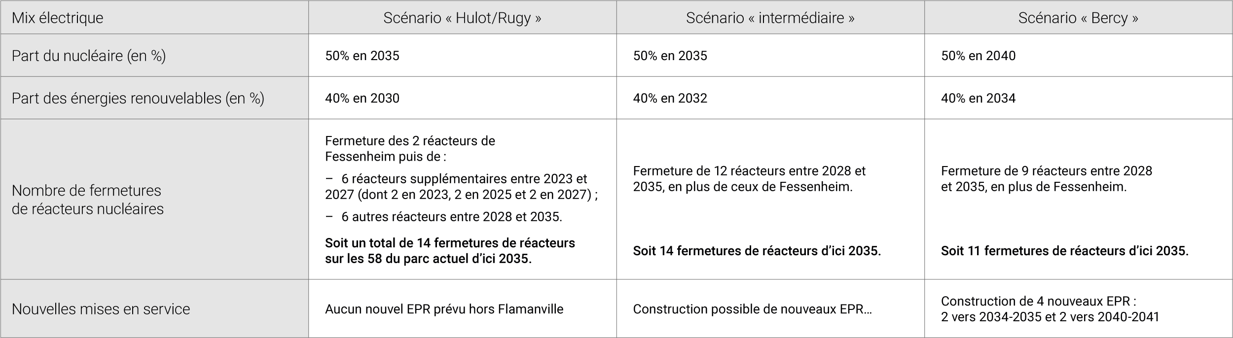 Dans les trois cas, il est prévu de fermer entre 11 et 14 réacteurs avant fin 2035 (en incluant les 2 tranches de Fessenheim dont l’arrêt est déjà acté) sur les 58 réacteurs en activité. Dans les trois cas, la part du nucléaire devrait baisser à 50% de la production d’électricité mais à des dates un peu différentes : 2035 dans le scénario « Hulot/Rugy » et le scénario dit « intermédiaire », et 2040 dans le scénario « Bercy ».