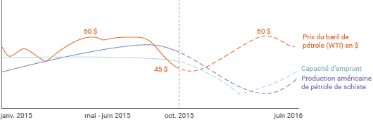 Aujourd’hui, la production américaine de pétrole de schiste chute chaque mois d’environ 50 000 barils par jour. Cette chute pourrait être trois fois plus rapide (chaque mois, une baisse supplémentaire de 150 000 barils par jour) après les renégociations des crédits actuels. La production de pétrole de schiste des États-Unis pourrait au total baisser de plus d’un million de barils par jour début 2016 par rapport au pic de l’été 2015.