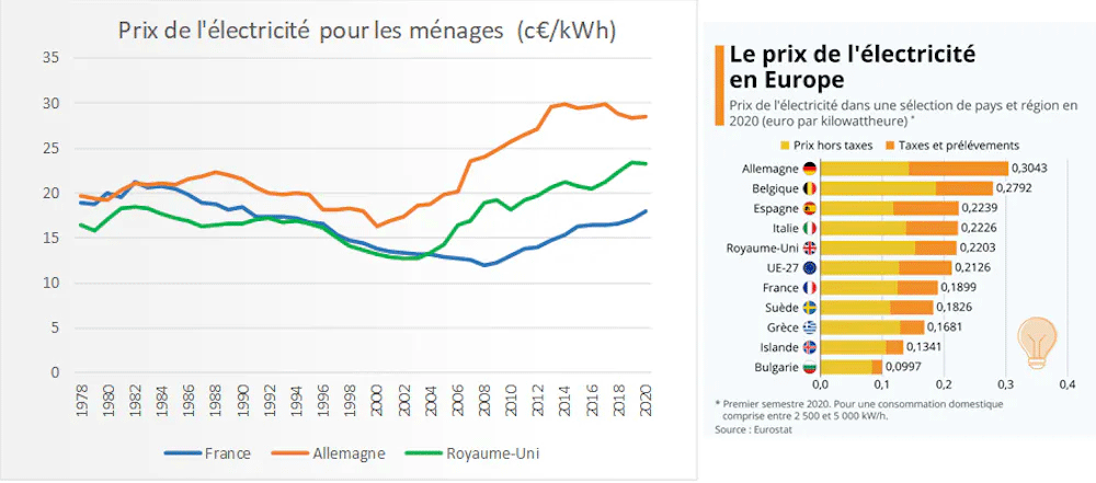 Évolution des prix de l’électricité en France, Allemagne et Royaume-Uni. (©Auteurs, données Enerdata (gauche)/Statista (droite))