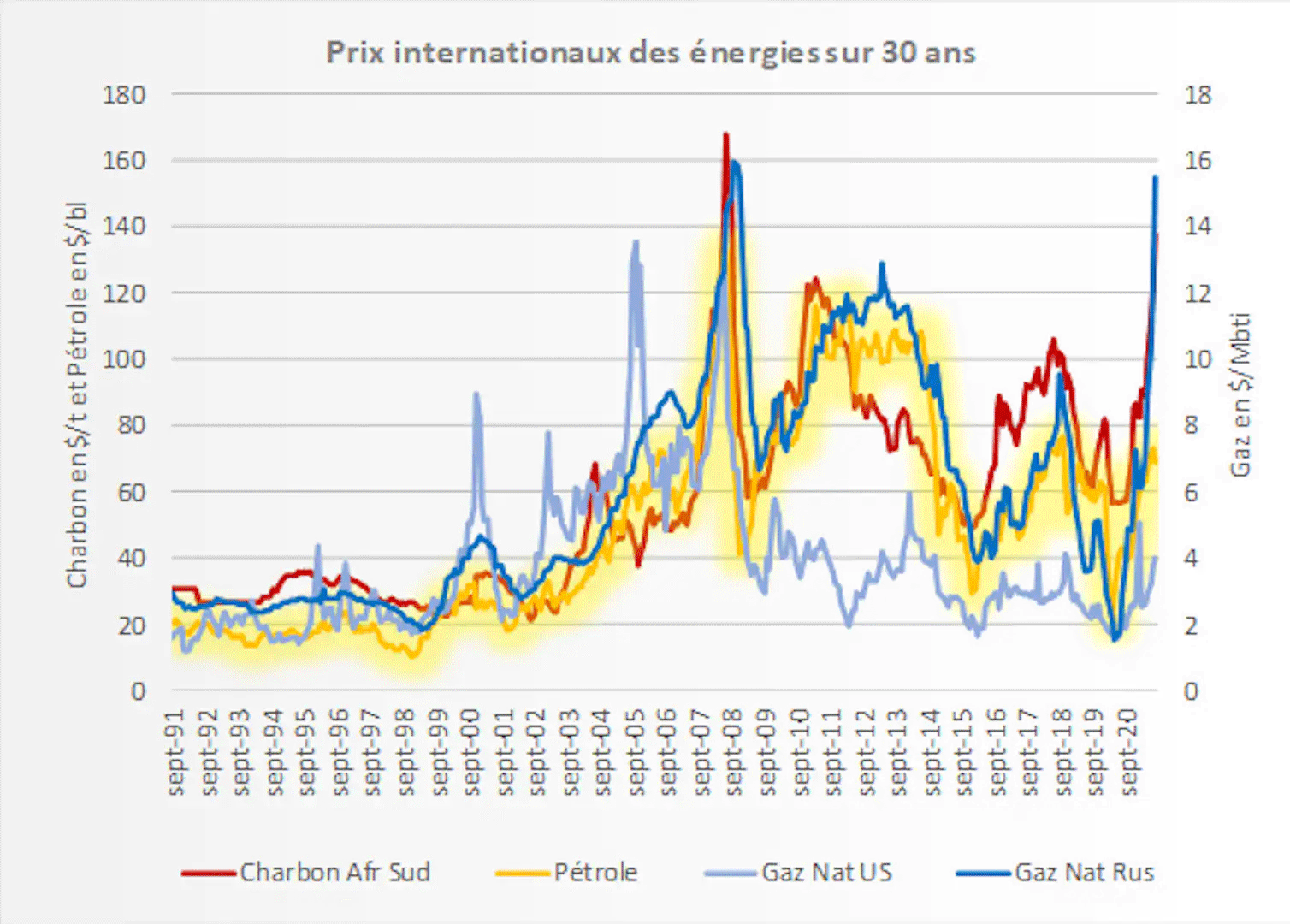 Aujourd’hui, c’est aussi en partie à cause du remplacement du charbon par le gaz naturel – une énergie dite de « transition », car carbonée mais moins que le charbon – qu’opère actuellement la Chine dans ses centrales électriques que le prix du gaz augmente au niveau mondial. La transition énergétique « bas carbone » impose le recours à des solutions énergétiques plus coûteuses en moyenne que le recours aux fossiles, ce qui suppose que le prix de ceux-ci soit augmenté.