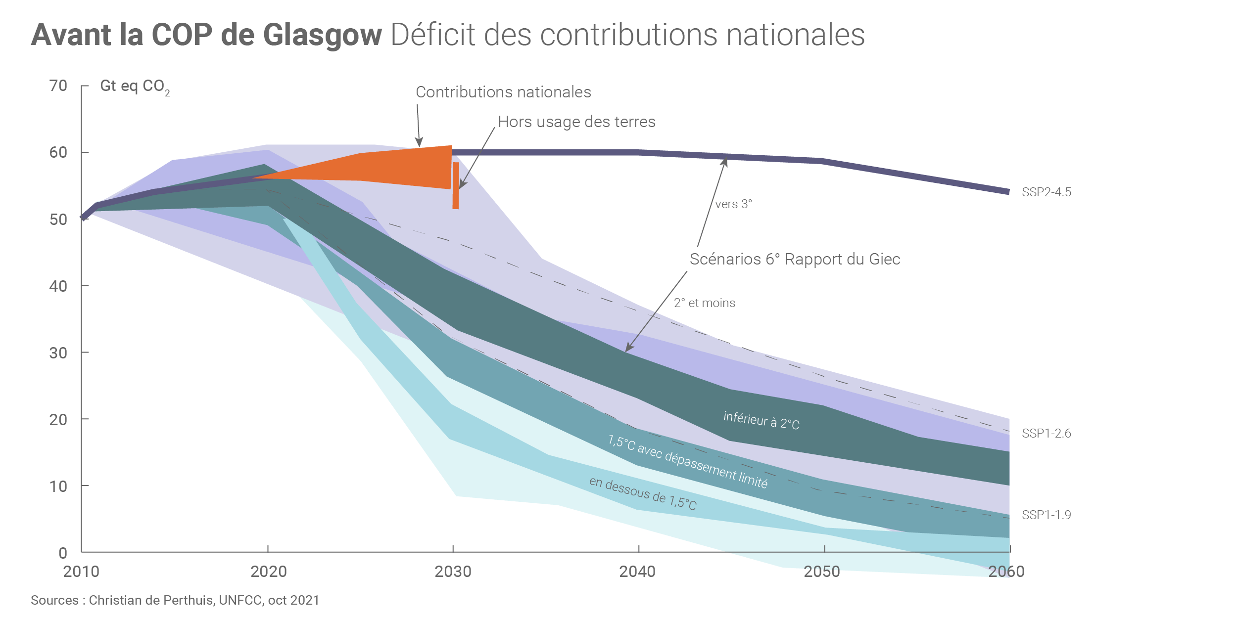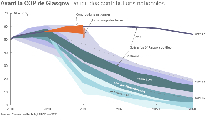 D’après le bilan établi à la veille de la conférence par le secrétariat de la Convention(1), la pleine réalisation des contributions nationales déposées avant la conférence conduirait à des émissions de 55 Gt de CO2eq en 2030. C’est certes 3,6 Gt de moins (- 6,2%) que celles déposées en 2015. Cela reste bien trop (d’environ 26 Gt pour viser 1,5°C et 12 Gt pour 2°C) pour se mettre sur le chemin de la neutralité. L’étude annuelle Emission Gap du Programme des Nations unies pour l'environnement (UNEP en anglais)(2) confirme le diagnostic en le déclinant par pays.