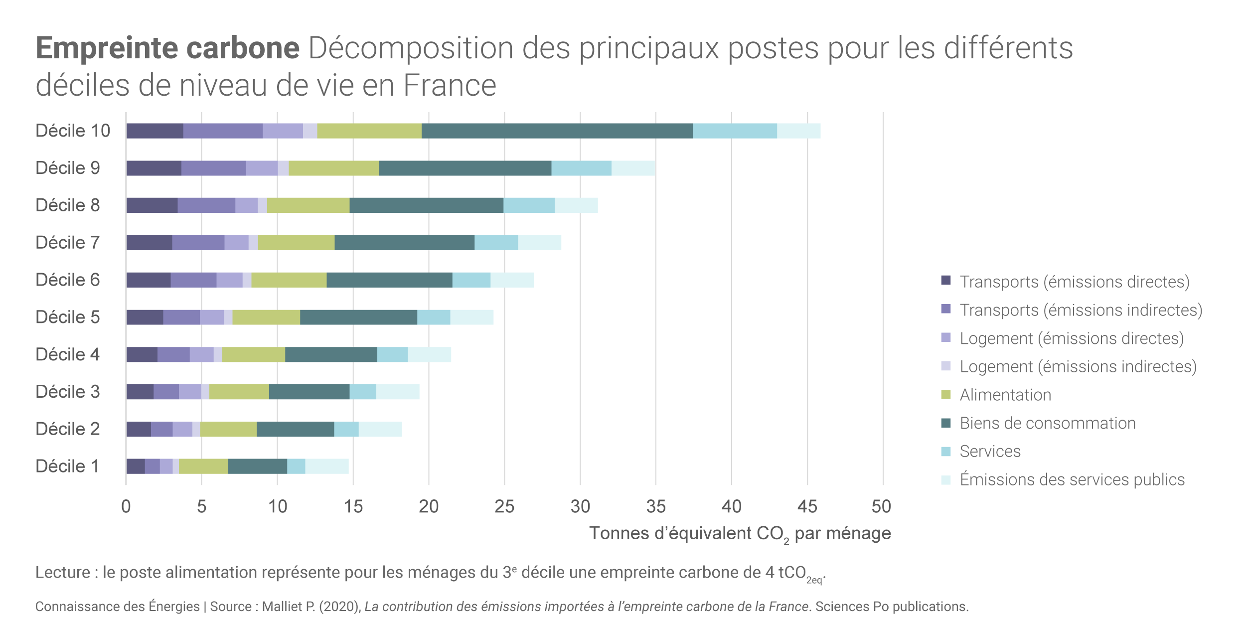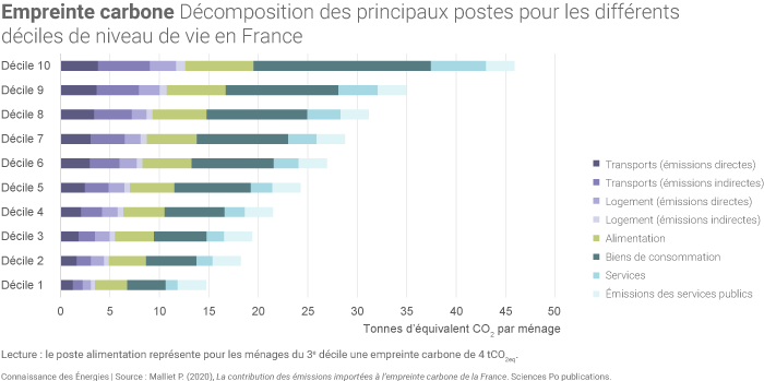 Le chapitre 9 reprend les éléments, désormais connus, sur la distribution des émissions directes et indirectes suivant le revenu : elles varient de un à trois entre les déciles extrêmes, le poste « transport » étant le plus discriminant (voir graphique ci-dessous). Une redistribution verticale permettrait de compenser ces inégalités. La correction des inégalités spatiales est nettement plus complexe. Ces inégalités, également considérables, expliquent l’hétérogénéité des émissions pour un même niveau de revenu.