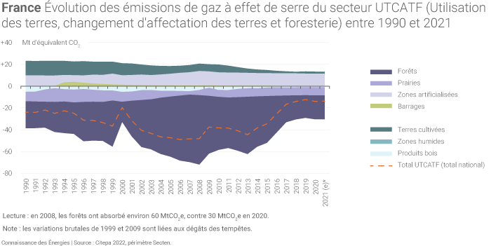 Dernière faiblesse à corriger, essentiellement concentré sur les volets énergétiques, le rapport Pisani-Ferry/Mahfouz ne traite que marginalement des émissions liées au carbone vivant : celles de méthane et de protoxyde d’azote de l’agriculture et celles, positives ou négatives, de CO2 résultant de l’usage des terres (le secteur « UTCATF » dans le jargon des experts). L’impact de la transition bas carbone sur les prix alimentaires et l’inflation n’est pas mentionné. Les investissements dirigés vers l’agriculture et la forêt sont faibles et manifestement pas calibrés pour faire face à un problème majeur : l’épuisement du puits de carbone national. Le rapport rappelle pourtant dans un encadré que l’écart le plus grand entre les objectifs visés par la SNBC et les réalisations n’apparaît pas dans les émissions brutes. Il résulte de la perte d’efficacité du puits de carbone forestier dont la capacité d’absorption de CO2 atmosphérique a été divisée par trois depuis le milieu des années 2000 (graphique ci-dessous).