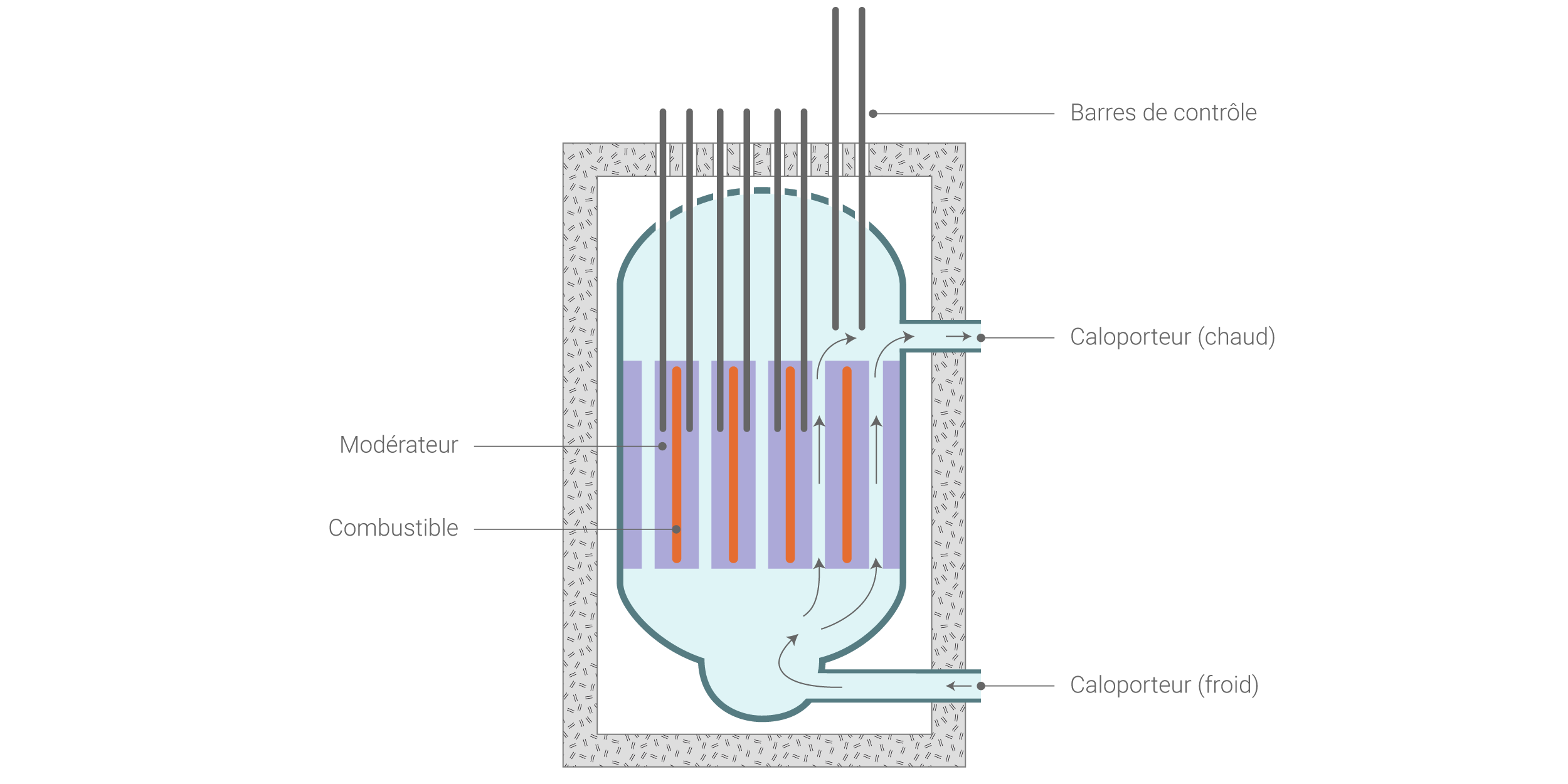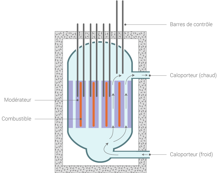 Dans le cœur d’un réacteur nucléaire : le triptyque combustible-modérateur-caloporteur définit le type de réacteur. Par exemple, pour les réacteurs à eau pressurisée utilisés en France pour la production d’électricité, le combustible est l’uranium enrichi, le modérateur et le caloporteur sont de l’eau. (©Connaissance des Énergies d'après Elsa Couderc, modifié à partir d’Emoscopes, CC BY-SA)