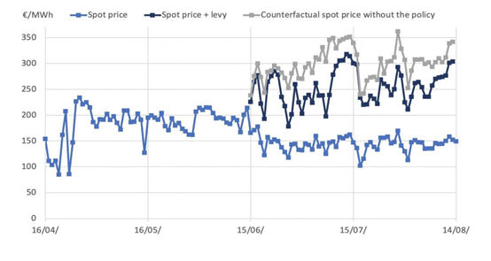 Graphique 2. Evolution du prix spot de l’électricité en Espagne en 2022. Le prix spot (bleu) est sensiblement inférieur au prix spot moyen de l’U.E. (en gris clair). Le consommateur espagnol ne profite toutefois pas totalement de la baisse puisqu’il paie un prix (en noir) qui inclut une taxe sur la consommation d’électricité. (Source : Lion Hirth et al. « The Iberian Electricity Market », CEPR, , twitter 29/8/2022)