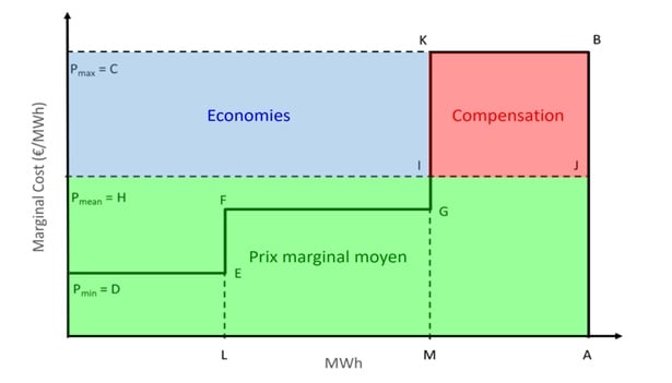 Les centrales marginales dont le coût marginal est supérieur à ce prix d’équilibre perçoivent une compensation (surface IJBK en rouge) qui leur permet de couvrir leur coût variable. La rente infra-marginale passe de CKGFED à HIGFED ce qui permet d’économiser la surface CKIH (en bleu) pour le consommateur final. In fine le consommateur paie la surface HJAO (surface en vert) au lieu de CBAO. Mais le contribuable ou le consommateur doit supporter la compensation KBJI. Il faut également vérifier que la rente infra-marginale résiduelle permet de financer les coûts fixes du parc, ce qui sera le cas lorsque le différentiel entre coûts variables des centrales appelées est très élevé. Sur la base des chiffres observés en 2021-2022 c’est bien le cas, comme le montre l’étude parue dans la Revue de l’Energie.