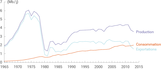 Production, consommation et exportations de pétrole brut de l’Iran (©Connaissance des Énergies, d’après données de BP)