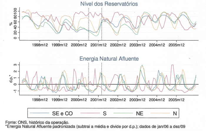 Dans les années qui ont précédé le rationnement, le graphique montre que le niveau des lacs des régions Nordeste (NE), Sudeste & Centre-Ouest (SE & CO) avait baissé régulièrement, parce que les apports en eau naturel étaient plus faibles que d’habitude. Dans une telle situation, on attend souvent en espérant la pluie et on vide progressivement les lacs. Mais la pluie n’était pas venue assez vite dans ce cas précis et le niveau des lacs était devenu préoccupant. Compte tenu des fortes pluies dans le Sud, le rationnement y était inutile puisque l’énergie y était abondante.