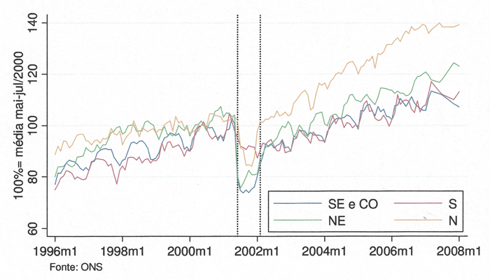 Le rationnement a eu un impact mécanique sur la consommation, puisqu’il était imposé. Or, il a été constaté que l’impact du rationnement a aussi duré au-delà de la période de rationnement et s’est prolongé alors que l’électricité était redevenue abondante et peu chère. Les courbes suivantes montrent l’évolution des consommations d’électricité dans les différentes régions brésiliennes.