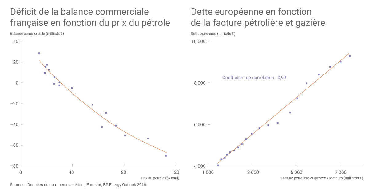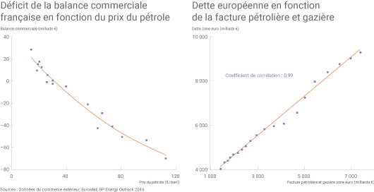 Depuis le milieu des années 1980, la facture énergétique de l’Europe s’est accrue de façon impressionnante. Elle apparaît aujourd’hui comme un contributeur majeur à sa dette souveraine. Dette et facture énergétique sont étonnamment corrélées (Figure 2 - droite). Fin 2014, la dette européenne frôlait les 10 000 milliards d’euros; sa facture pétrolière et gazière cumulée depuis 1987 atteignait 7 500 milliards d’euros. Entre 1993 et 2010(2), la dette de la France a augmenté de 1 000 milliards d’euros(3). Durant la même période, ses importations de pétrole et de gaz ont représenté 750 milliards d’euros. En 2012, la seule facture pétrolière et gazière contribuait pour près de 90% du déficit commercial de l’hexagone c'est-à-dire l’équivalent de 3% du PIB français (Figure 2 - gauche). A système social constant, la dette n’est finalement que la somme des achats d’hydrocarbures et du remboursement de la dette.