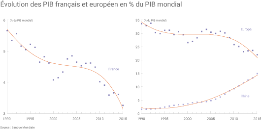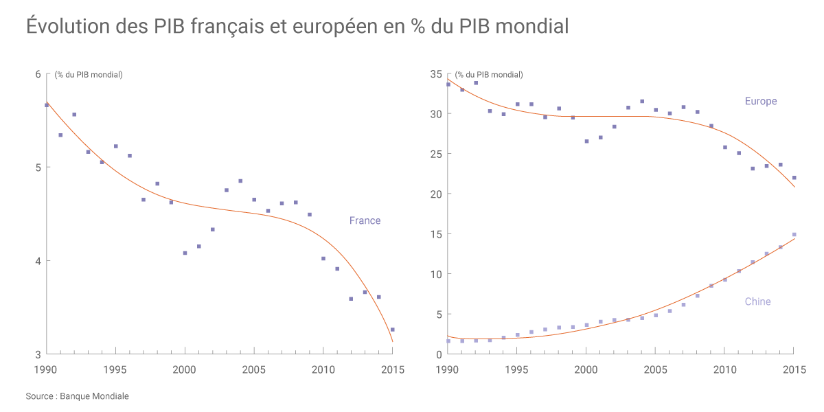 Durant les Trente Glorieuses, les États-Unis et l’Europe représentaient les deux tiers de la richesse mondiale. En 2015, ils ne comptaient plus que pour 40%. Quant au PIB de la France, son poids relatif a été réduit de moitié, passant de 6% du PIB mondial en 1980 à un peu plus de 3% aujourd’hui. Face à la Chine et aux États-Unis, la France ou l’Allemagne n’ont plus qu’un poids négligeable. Par contre, l’Europe prise comme entité économique pèse aujourd’hui, comme les États-Unis, pour plus de 20% de la richesse mondiale, soit 6 points de plus que la Chine (Figure 1).