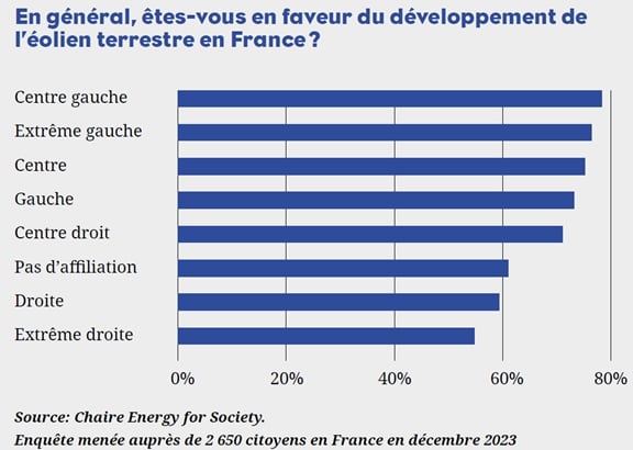 Ce phénomène d’opposition s'inscrit dans un contexte où les préférences sur l’éolien deviennent de plus en plus polarisées sur le plan politique. Un autre recherche questionnant 3 871 citoyens français entre 2023 et 2024 montre qu'il existe un clivage marqué entre les partisans des différentes orientations politiques. Les sympathisants des partis d'extrême droite (et de droite dans une moindre mesure) se montrent nettement plus opposés à l’éolien terrestre, tandis que ceux du centre et de la gauche expriment un soutien plus fort à ce type d’énergie.