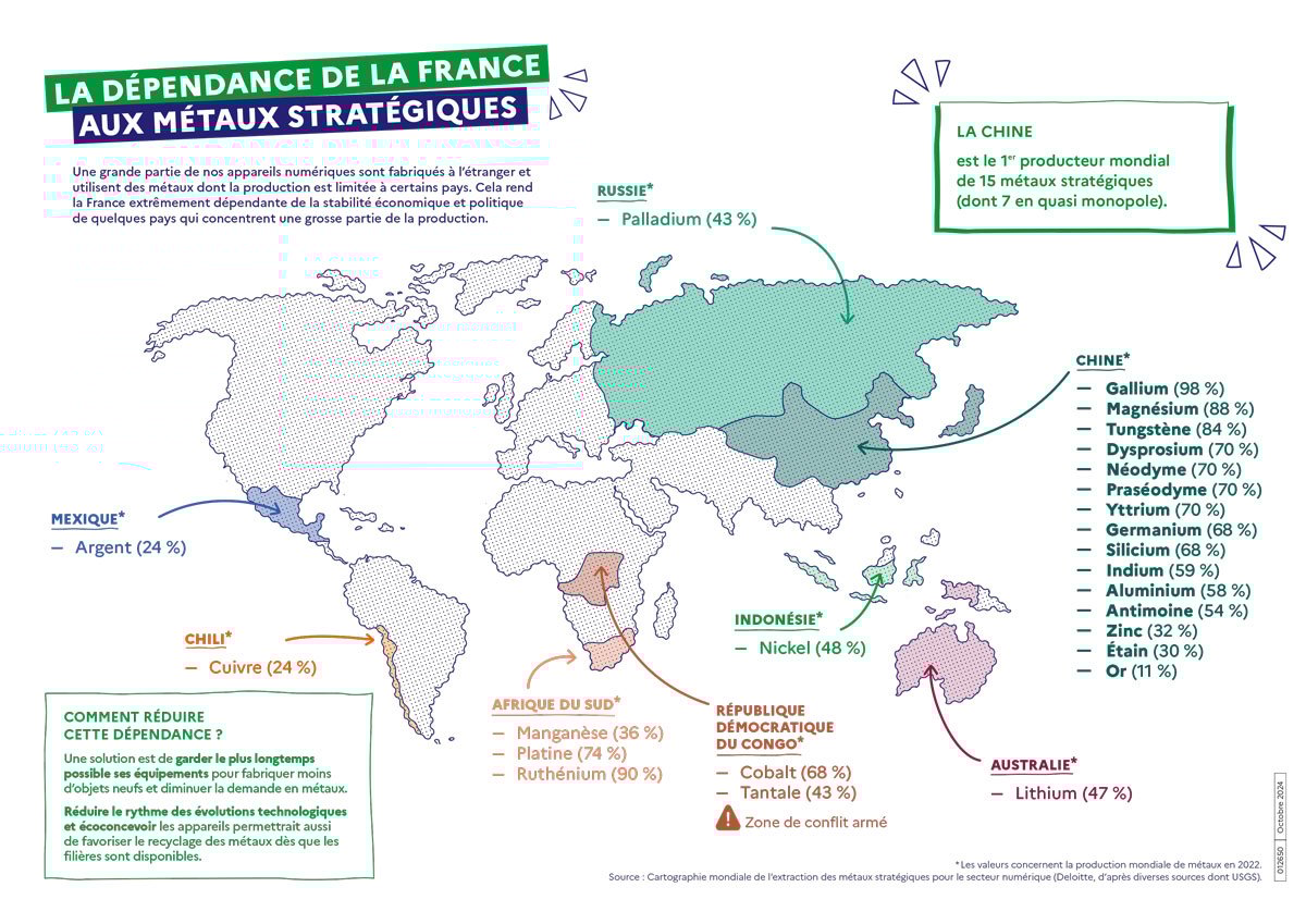 Rappelons d’abord que la chaîne de valeur de l’extraction des métaux n’est pas située en Europe. Les métaux utilisés dans les équipements du numérique sont produits partout dans le monde à l’exception de l’Europe (en dehors de la Russie qui exploite le palladium). Cela pose, pour le Vieux Continent, de forts enjeux de souveraineté, avec une dépendance extrêmement forte vis-à-vis d’un petit nombre de pays pour la plupart des métaux.
